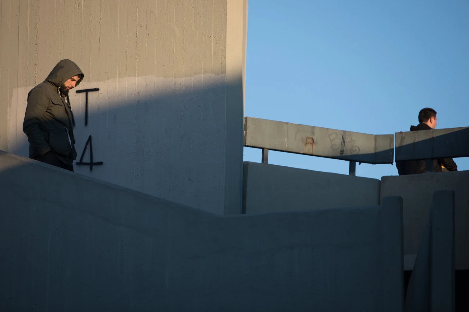 Prizor koji sam primetio kao interesantno platno za trenutak. Svidele su mi se senke, geometrija, odnos plavog neba i tople boje betona, a pošto su u pitanju stepenice pretpostavio sam da bi vrlo brzo mogao da se dogodi neki interesantan trenutak.